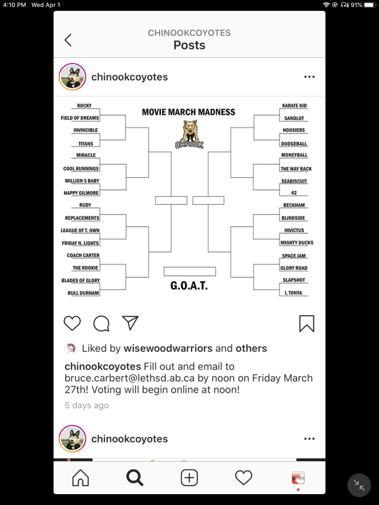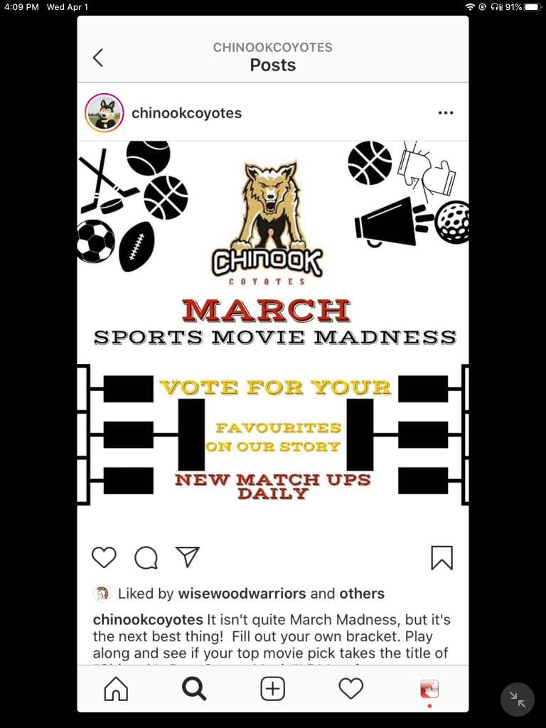 Building School Culture Social Distance mode – all of our schools have active Instagram accounts so posting there was our focus. @chinookcoyotes is doing March Sports Movie Madness. They got inspiration from @wisewoodwarriors and @sconaathletics – check out those accounts for more info