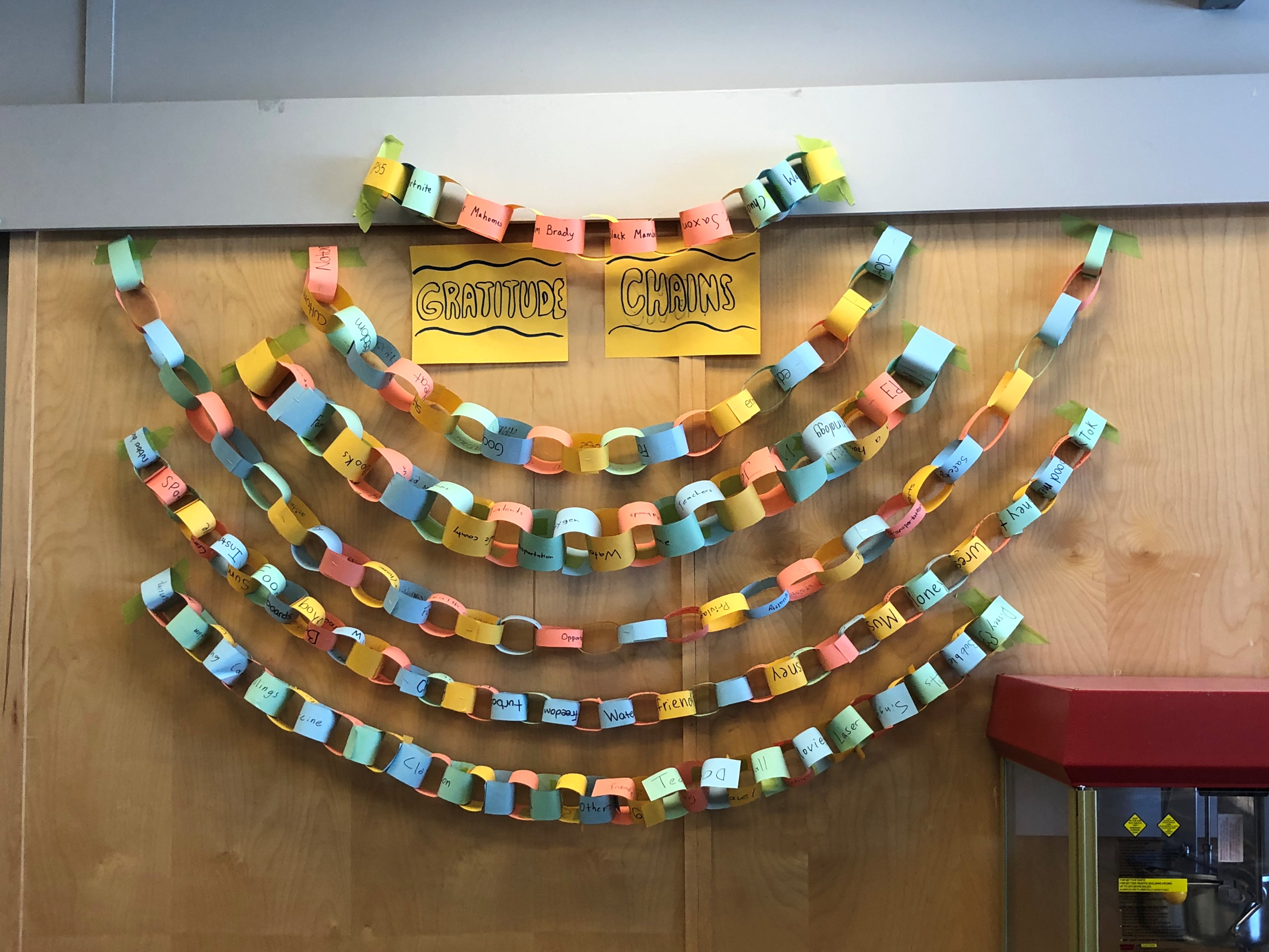 Have them get into groups of 3-5 people. They are going to make gratitude chains. They need at least 16 links on the chain. They can do more if they want. I have left 4 colors of paper on a table in the room and cut one paper into 4 strips as a demo. Each strip is a link in the chain.