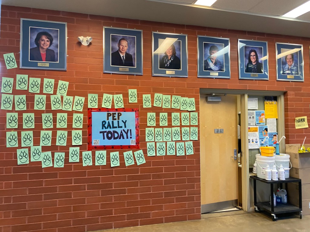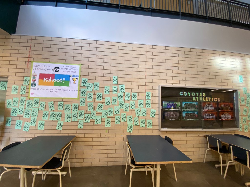 The night before we decorated the school so that when kids walked in Friday morning they knew the Pep Rally was on. We decorated both door entrances and also put up coyote paw prints with every student’s and staff’s name on them – 1300 in total. One of my students said there was a really cool vibe that morning as students and staff searched for their paw prints. Why put up everyone’s name? A simple way to build connections and show that everyone was remembered and belong at Centennial.