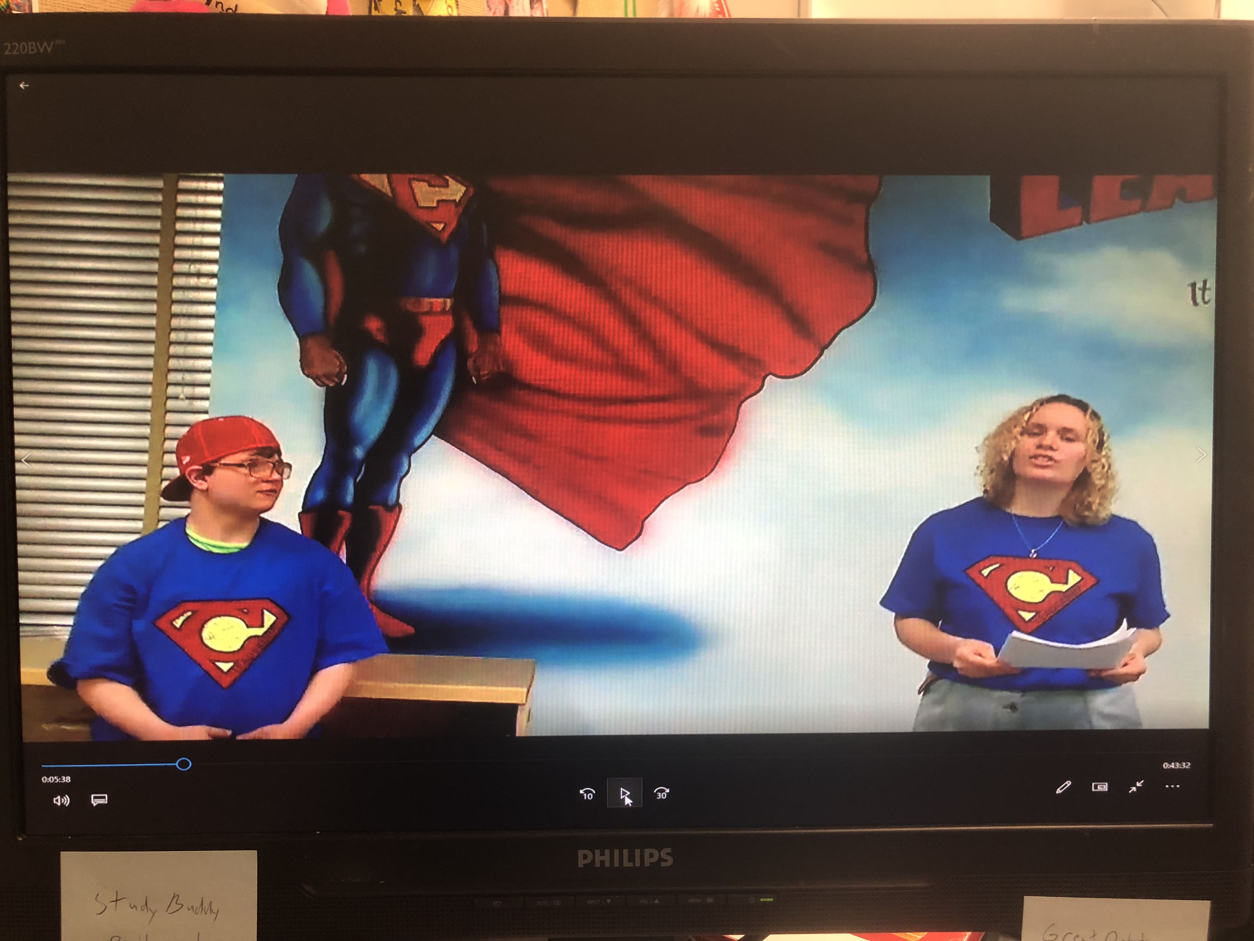 Then came the scavenger hunt. We had two different MCs on camera introducing the activity and explaining the rules. We also had an accompanying PowerPoint to show them. Classes were given 3 questions to answer from the Yote Street video. They also had to identify where students were in the pictures. Each class had a card. Two students were chosen to run to each area, answer the question correctly, and get a stamp. Once they had three stamps they were shown a picture of the Coyote mascot in the gym. First class to get to the Coyote won Dilly Bars from DQ for their entire class.
