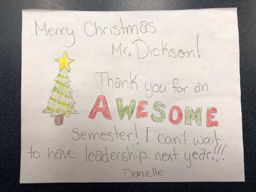 I had another unexpected heartwarming moment yesterday. A Gr 10 student gave me a Christmas present and card pictured above. She let me know that she made the present herself and I and one other teacher were the only ones that got one. Makes all the craziness around being a Leadership Advisor worth it.