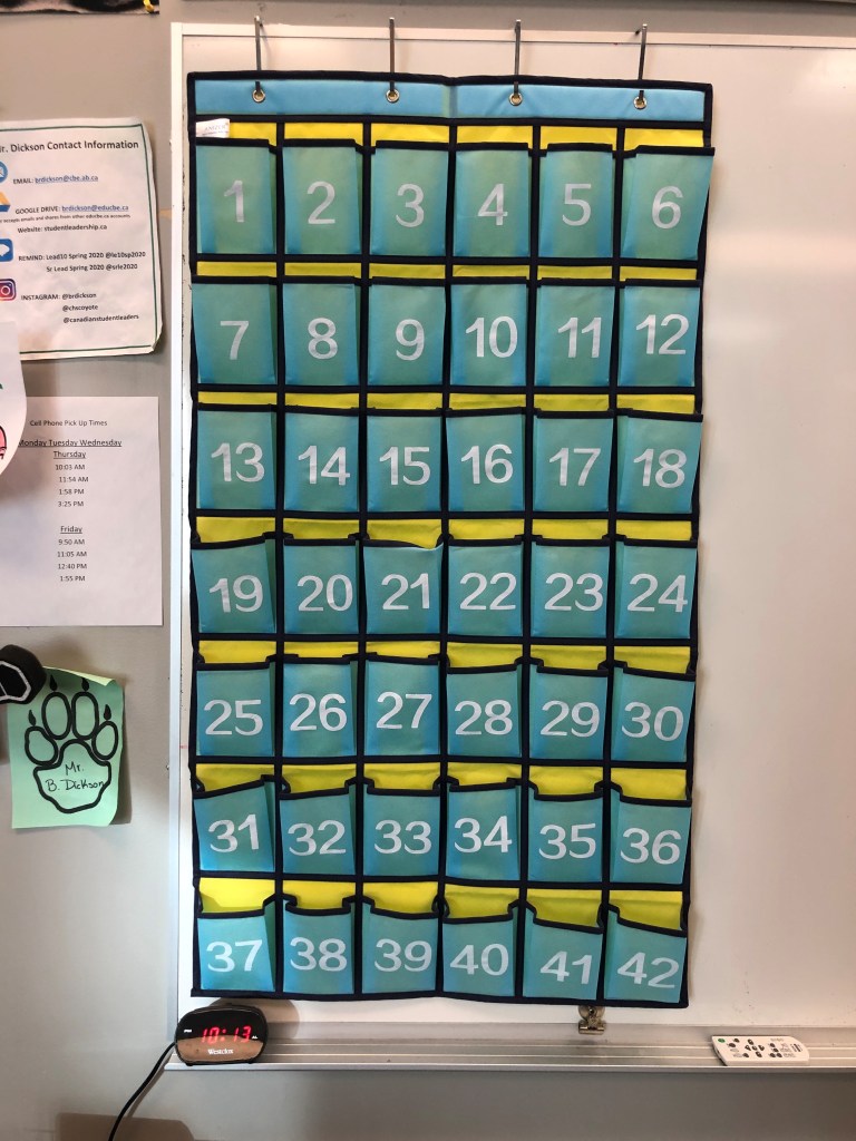 First thing students do when they arrive is to put their cell phone in the caddy.  They each have an assigned pocket # so that I know who may have left their phone behind (only happened once this semester 🙂 or who hasn’t put theirs away.